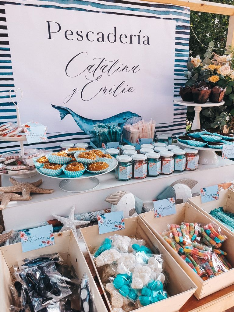 Una boda de aires marineros, inspirada en el mar, con una mesa dulce simulando una pescadería… ¡No nos pudo gustar más el resultado!