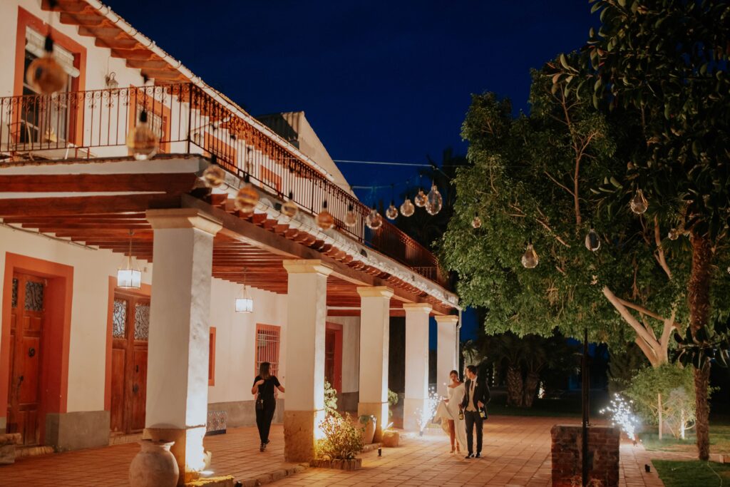 La Porxada es uno de los espacios más representativos de la casa señorial del siglo XIX por su techo original de vigas de madera, un auténtico símbolo de la arquitectura tradicional del Camp d’Elx. Desde aquí se disfruta de unas vistas privilegiadas al Jardín y al Huerto de Naranjos, lo que la convierte en un lugar perfecto para recibir a los invitados, compartir un cóctel de bienvenida resguardado o celebrar una comida o cena íntima en un entorno protegido pero completamente integrado en la naturaleza.